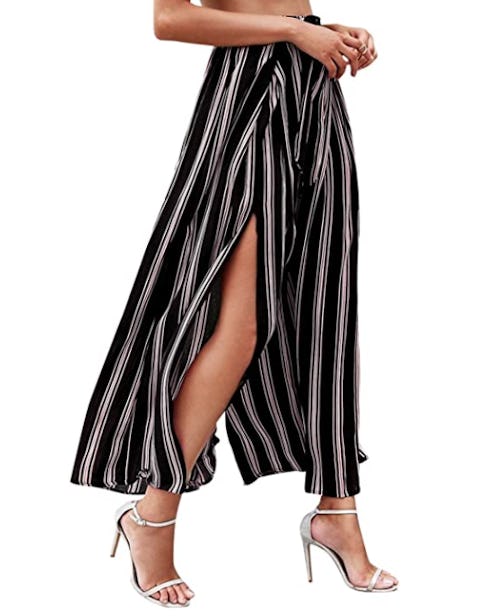 These high-waisted trousers feature side slits and have a flowy silhouette for easy breeze movement. The elastic waist features a belt that can adjust the size for a perfect fit. You can style them for the beach or dress them up for dinner with heels. And if you want to make a statement, these pants also come in leopard and stripe patterns.