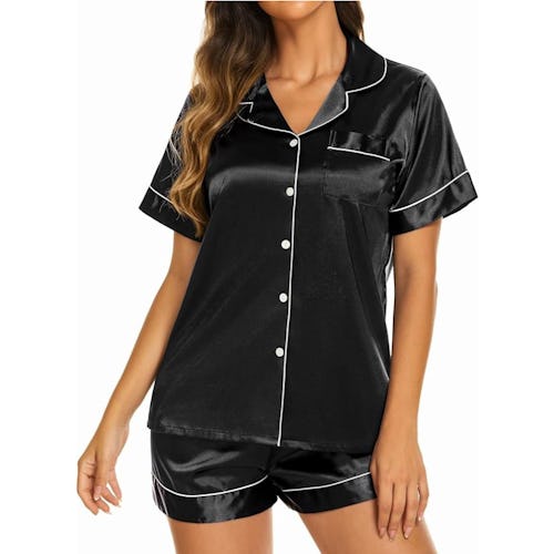 This cute pajama set comes with elastic waist shorts and a button-down short-sleeve shirt. Both styles are crafted from a premium polyester blend that feels just like luxurious silk. This style is ideal for anyone who runs hot in the middle of the night since the fabric is breathable and lightweight. Snag them in rich solid colors or a dainty floral print.