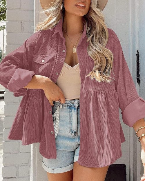 This corduroy shacket is designed with an adorable peplum hem and is the perfect layer to create an instantly stylish outfit. It’s detailed with a top collar and has chest pockets on both sides. The material is super warm and soft and looks great with any type of bottom. Wear it open as an extra layer over a tank top or style it fully buttoned.