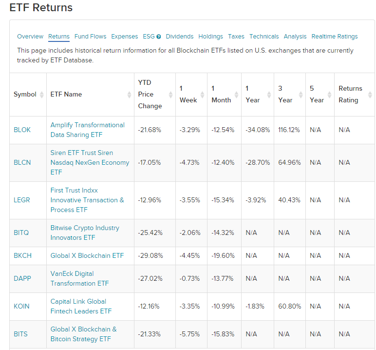 Click on the tabs below to see more information on Blockchain ETFs, including historical performance, dividends, holdings, expense ratios, technical indicators, analysts reports and more. Click on an ETF ticker or name to go to its detail page, for in-depth news, financial data and graphs. By default the list is ordered by descending total market capitalization.