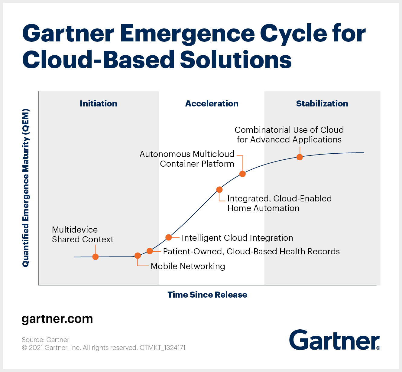 “Cloud” is a broad topic, and the emergence cycle covers application models that leverage the cloud (like patient-owned cloud-based health records) and technologies that enable cloud-based applications, such as cloud-based mobile networking and container platforms — all at varying degrees of maturity.
