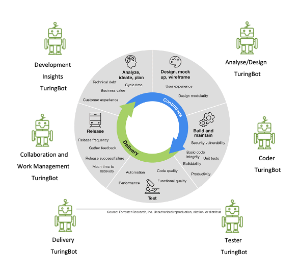 Depending on the development role, they can help during every stage of the continuous software development lifecycle. Analyze/design TuringBots can generate HTML5 code from handwritten user interface sketches during your UX team’s design workshops; coder TuringBots can look up technical documentation, share interface signatures with necessary parameters, and then auto–complete the code. Tester TuringBots can, for example, quickly automate thousands of visual tests over hundreds of web and mobile browser pages in seconds. Deliver TuringBots can automate configuration files for creating efficient DevOps pipelines; CWM TuringBots can simplify teams’ collaboration and share product/project information more effectively; and development insights TuringBots can augment all team stakeholders with data insights over quality, technical debt, business value, and more.