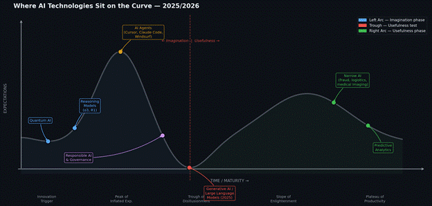 A more honest map looks like this. Narrow AI in specific domains — fraud detection, logistics optimisation, medical imaging analysis — has quietly crossed into the right arc. It is embedded, depended upon, and largely invisible to the public conversation. Large language models for general-purpose use are descending into the trough. The enterprise reality of 2025 — hallucinations, governance failures, unclear ROI, and the gap between demo performance and production reliability — is administering the usefulness test in real time. AI agents — autonomous systems like those being built into Cursor, Windsurf, and Claude Code — are near their own peak, generating fresh excitement before the trough has even arrived.