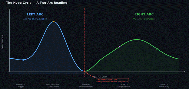 Figure 1: The Two-Arc Reading of the Hype Cycle — the trough is the usefulness test that separates imagination from evidence.