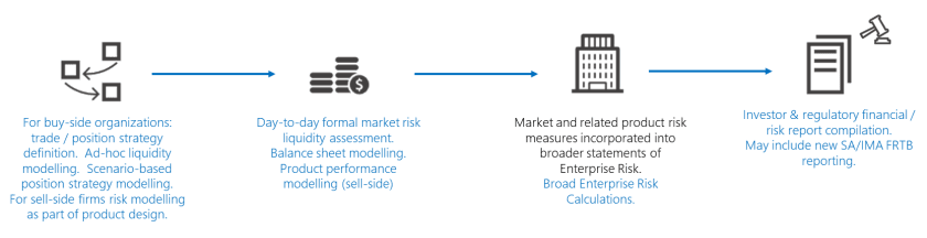 Risk calculations are pivotal at several stages in the lifecycle of key financial services operations. For example, a simplified form of the insurance product management lifecycle might look something like the diagram below. The risk calculation aspects are shown in blue text.