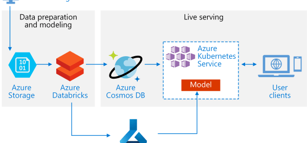 This reference architecture shows how to train a recommendation model using Azure Databricks and deploy it as an API by using Azure Cosmos DB, Azure Machine Learning, and Azure Kubernetes Service (AKS).