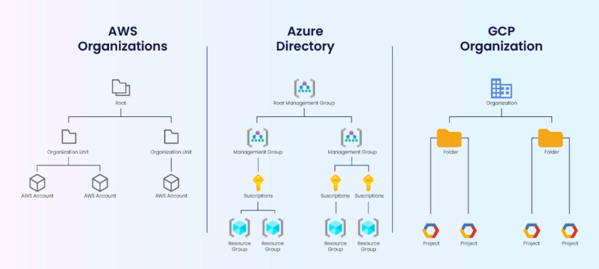 While Azure and GCP employ an RBAC model that imitates the organizational structure, AWS provides less structure and fewer management capabilities in its resource structure. This will be important later on when setting permissions across different resource levels.