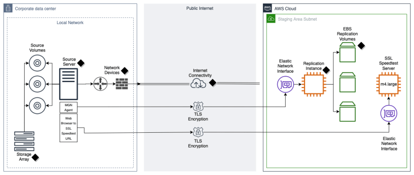 Figure 1. Data flow when using AWS Application Migration Service (black diamonds denote potential points of contention)