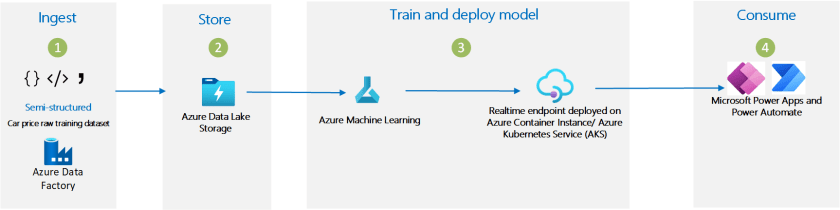 This example workload is designed to help a buyer or a purchasing agent in the automotive industry estimate a car’s market price. A user can use a Power App to submit vehicle details to a model that’s trained on market data and receive a price prediction in return.