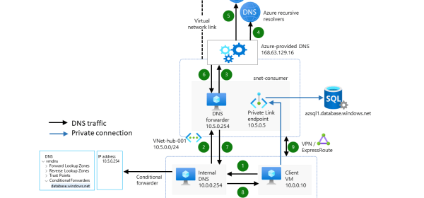 A conditional forwarder on the on-premises DNS server forwards requests to Azure, and a private DNS zone is linked to a virtual network. The following solution uses Azure DNS Private Resolver in a hub-spoke