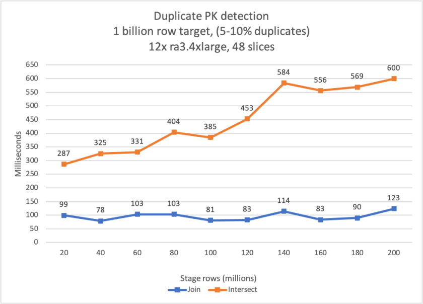 You can observe that the performance of both algorithms is excellent. Each is able to detect duplicates in less than 1 second for all trials. The join algorithm outperforms the intersect algorithm, but both have excellent performance.