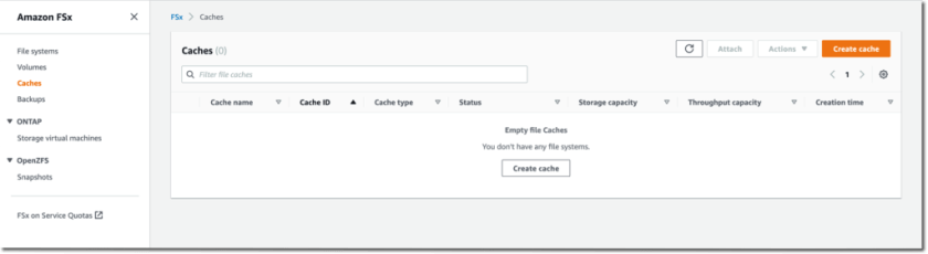 I open my browser and navigate to the AWS Management Console. I search for “Amazon FSx” in the console search bar and click on Caches in the left navigation menu. Alternatively, I go directly to the File Cache section of the console. To get started, I select Create cache.