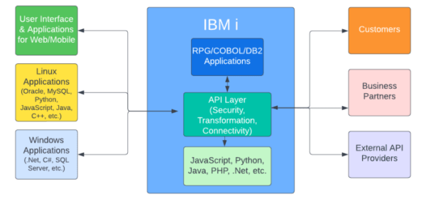 Without requiring extensive changes or rewrites, APIs enable access to your existing RPG/COBOL/DB2 application functions and data from new technologies while providing the ability to reach out from the IBM i to