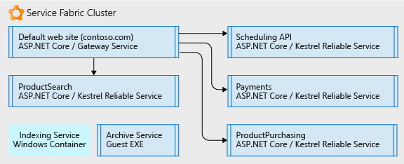 - Four ASP.NET Core applications that were formally virtual directories under the single IIS site running as ASP.NET applications. The applications were separated into their own independent microservices. The effect is that they can be changed, versioned, and upgraded separately. In this example, we rewrote each application using .NET Core and ASP.NET Core. These were written as Reliable Services so they can natively access the full Service Fabric platform capabilities and benefits (communication services, health reports, notifications, etc.).