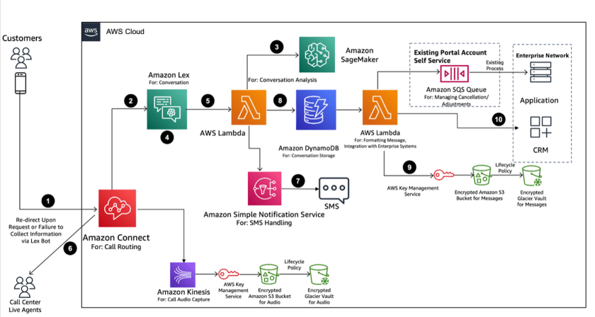 Further, all recorded calls may be stored in a secure AWS ecosystem and archived for longer durations for compliance purposes. Storage costs can be optimized by setting up a policy to move old calls to Amazon Simple Storage Service Glacier (Amazon S3 Glacier) storage classes and calls over two years old to the Amazon S3 Deep Glacier storage class. This results in significant cost saving and helps companies archive at scale.