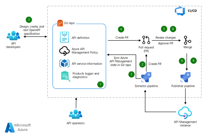 - API operators run the extractor pipeline to synchronize the Git repository with the API Management instance and populate the Git repository with API Management objects in the required format.