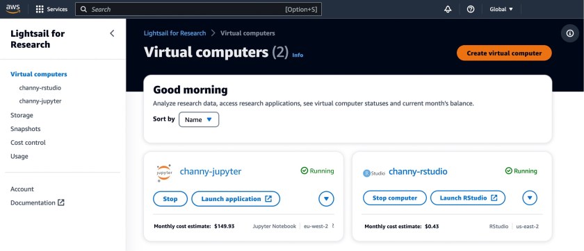 To get started, navigate to the Lightsail for Research console, and choose Virtual computers in the left menu. You can see my research computers naming “channy-jupyter” or “channy-rstudio” already created.