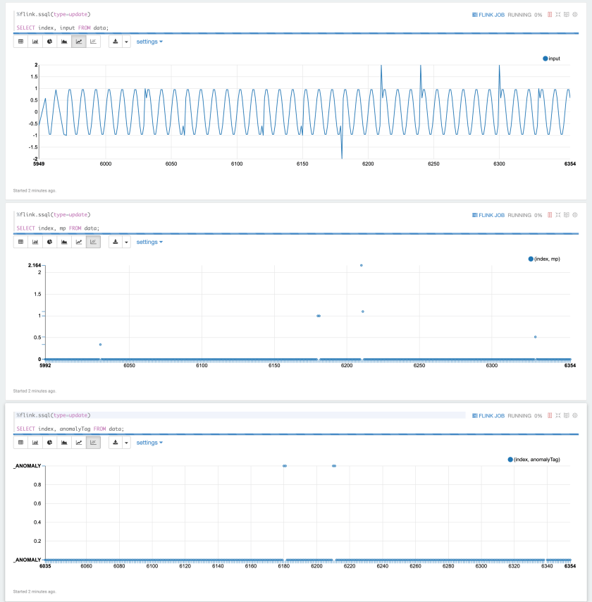 Kinesis Data Analytics Studio provides the perfect setup for observing data in real time. The following screenshot shows sample visualizations. The first plot shows the incoming time series data, the second plot shows the matrix profile, and the third plot shows which data points have been classified as anomalies.