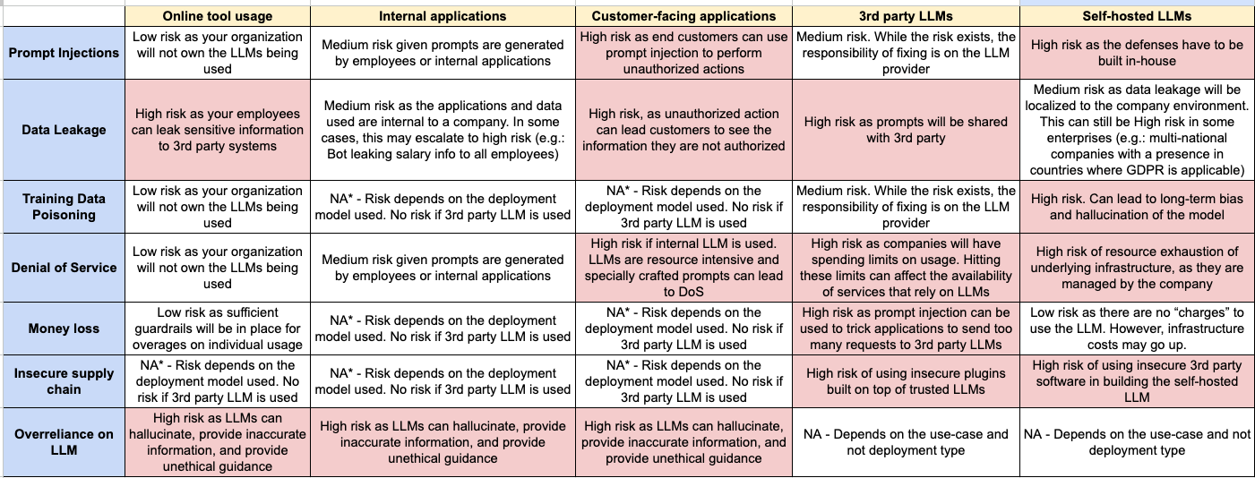 There is a possibility that there is no clarity on which of these use cases and deployment models are prevalent in your organization. In that scenario, your first job as a Security team would be to understand how LLMs are currently used and understand the plans for future usage. On the data gathered, you can apply the above framework to narrow down the risks that matter most to your organization.