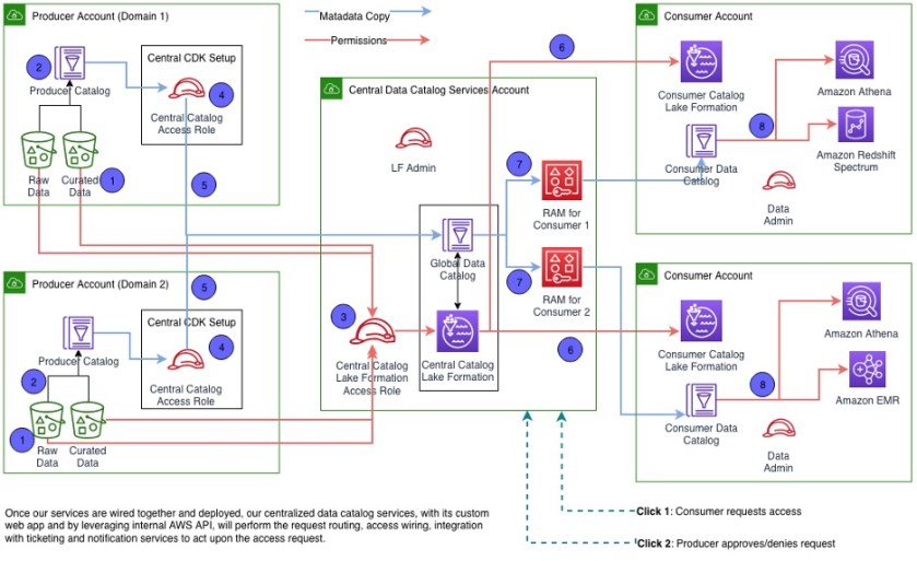 The following diagram shows AWS account boundaries for producers, consumers, and the central catalog. It also describes the steps involved for data producers to register their datasets as well as how data consumers get access. Most of these steps are automated through convenience scripts with both AWS CDK and CloudFormation templates for our producers and consumer to use.