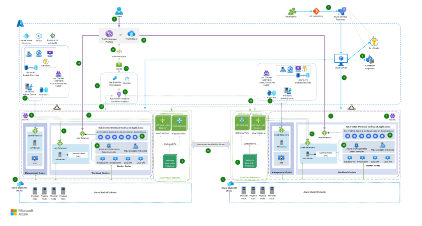 The architecture shows the deployment of hybrid solutions by using Azure Arc-enabled services on Azure Stack HCI, Azure Pipelines, and the integration of a global load balancer and an Azure Function App.