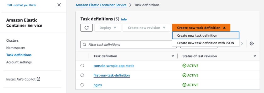 Go to the Amazon ECS console, navigate to Task definitions, and choose Create new task definition.