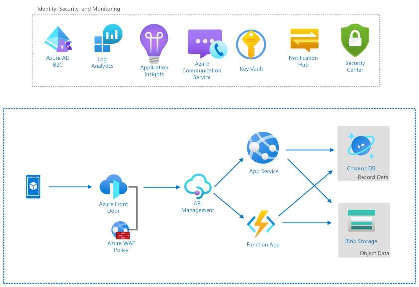 - The authenticated data is then routed by Azure API Management (APIM) to either the front-end interface for the users on the Azure App Service, or APIs hosted in Azure Functions.
