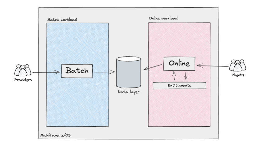The Mainframe supported two distinct types of workloads: batch processing and, for the product API layers, online transactions. The batch workloads resembled what is commonly referred to as a data pipeline. They involved the ingestion of semi-structured data from external providers/sources, or other internal Mainframe systems, followed by data cleansing and modelling to align with the requirements of the Consumer Subsystem. These pipelines incorporated various complexities, including the implementation of the Identity searching logic: in the United Kingdom, unlike the United States with its social security number, there is no universally unique identifier for residents. Consequently, companies operating in the UK&I must employ customised algorithms to accurately determine the individual identities associated with that data.