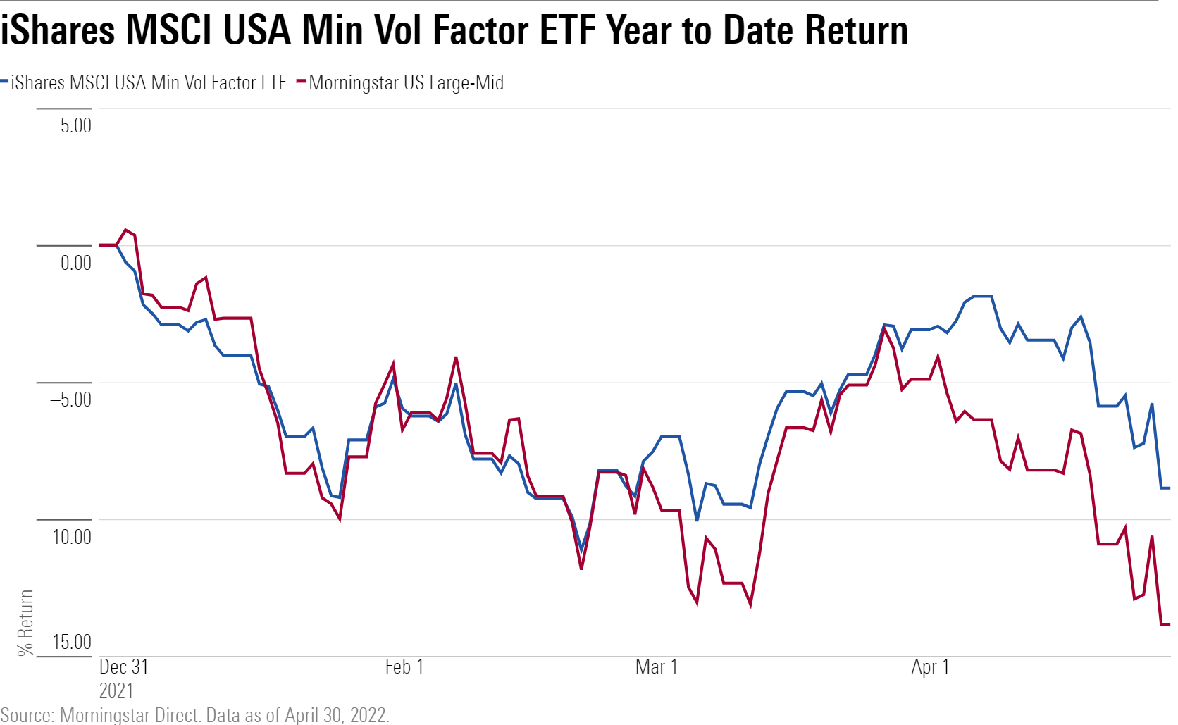 IShares MSCI USA Min Vol Factor ETF (USMV) is the lone Morningstar Medalist in the group. The Silver-rated ETF finished 4.97 percentage points better than the Morningstar US Large-Mid Index for the year to date through April 2022.