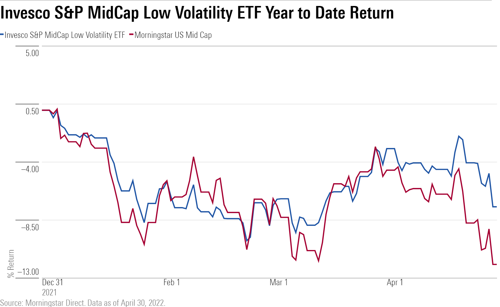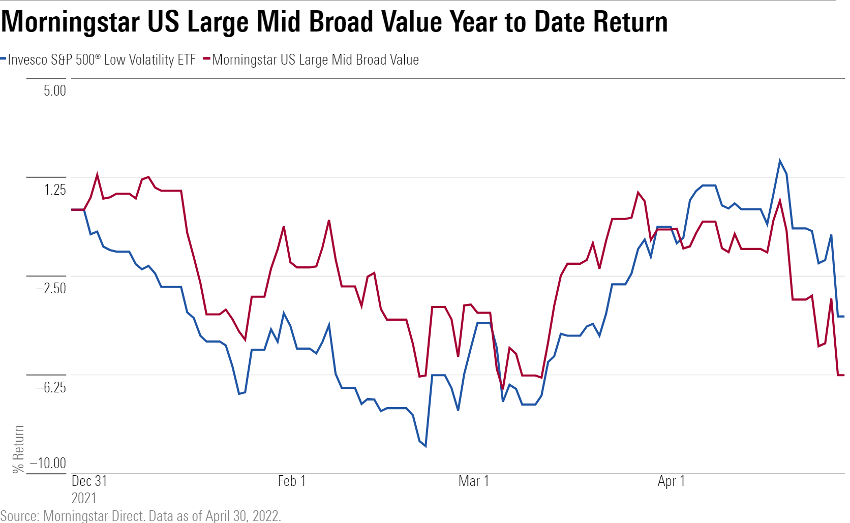 In the large-value Morningstar Category, Invesco S&P 500 Low Volatility ETF (SPLV) has outperformed its Morningstar index by 2.22 percentage points over the last year. This was aided by strong performance in April, when the fund finished in the third percentile of the large-value category.