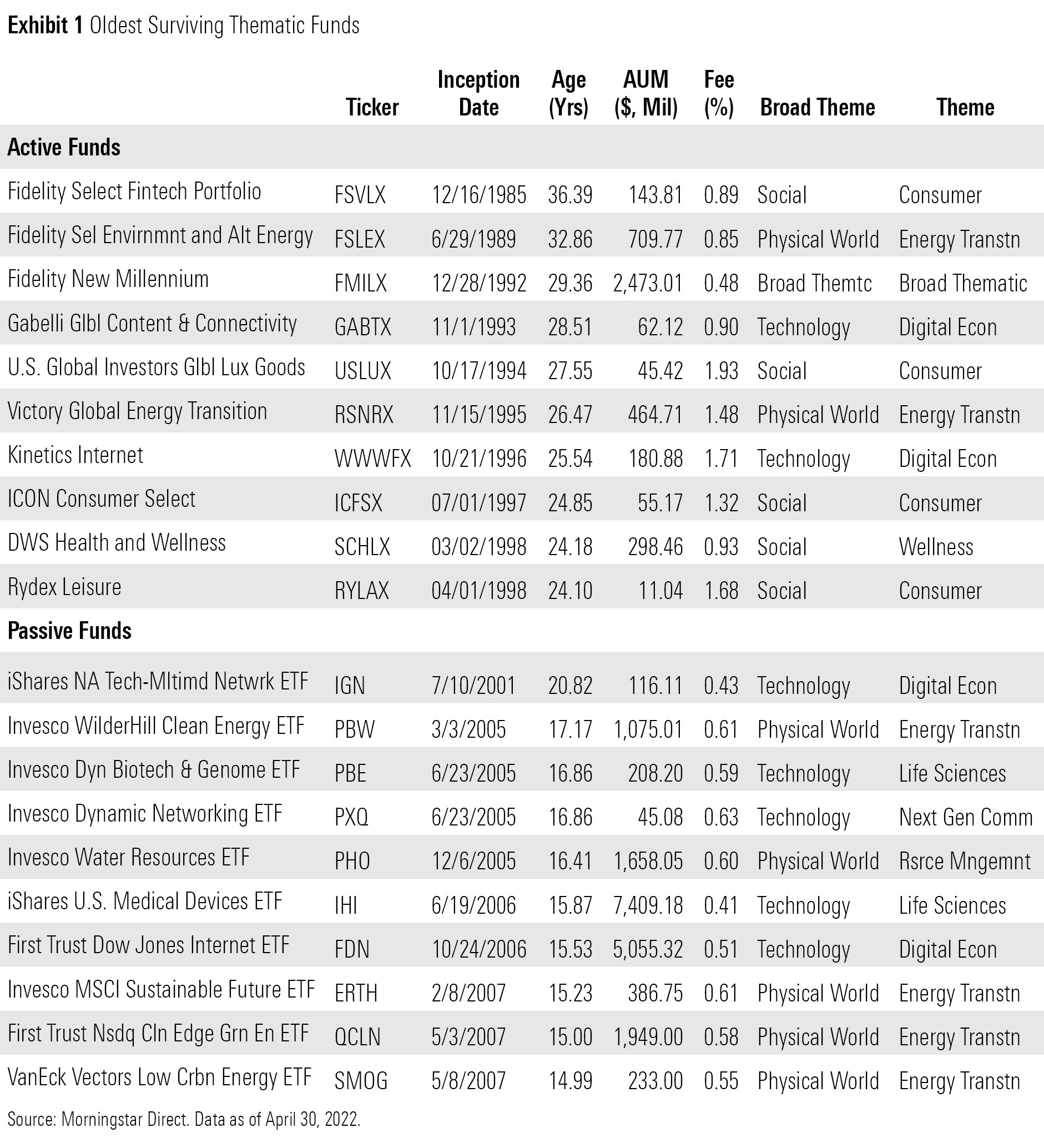 Exhibit 1 contains a snapshot of the oldest surviving thematic funds. These funds’ themes are emblematic of the time they made their debut. Most of the active funds on this list came to market in the 1990s and focused on the internet and consumer spending trends. Five of the passive funds in this list came to market in the 2000s and focused on sustainable investment themes. Through the years, these themes haven’t been consistently popular with investors, but the funds have nonetheless persisted.