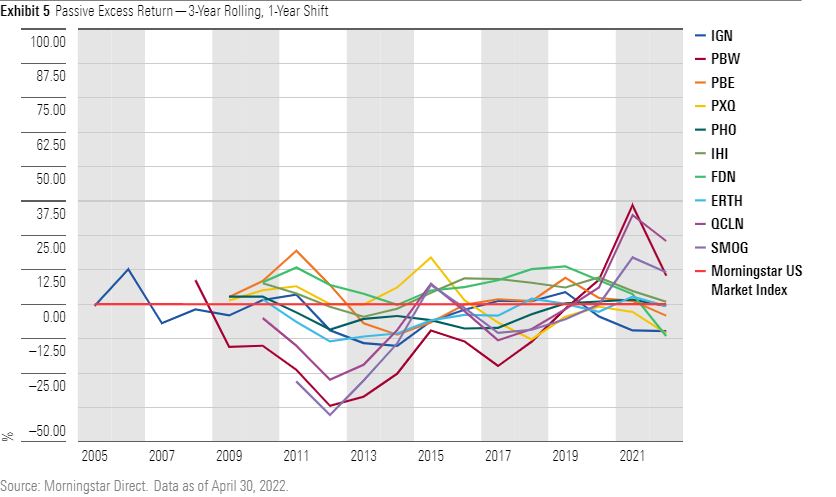 Exhibits 4 and 5 plot the excess returns of these funds against the broad US market over a three-year rolling window.