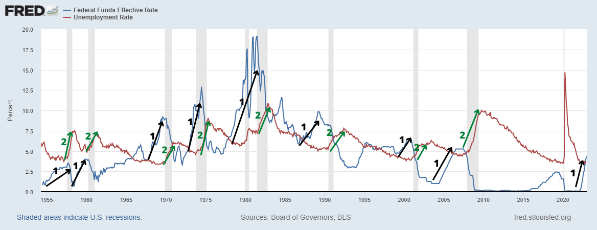 Fed Funds Effective Rate (blue line) Vs Unemployment rate (red line) (FRED)