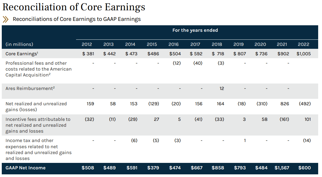 PE ratios, on the other hand, have more than doubled, due to significant capital losses (negative earnings) from lower bond prices. Prices are down due to higher interest rates and widening credit spreads. These capital losses will almost certainly prove to be (mostly) temporary, as loans must always be repaid in-full at maturity. Underlying interest rate income is up, even as accounting earnings are down. As an example, ARCC saw double-digit core earnings growth in 2022, in large part due to higher interest rates.