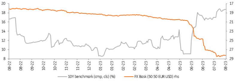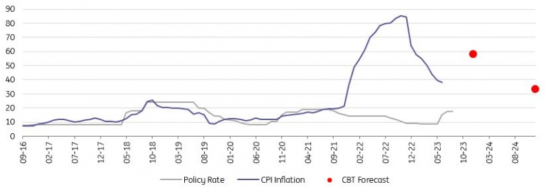 Following its first hike in more than two years by 675bp in June, the CBT continued the hiking cycle with another 250bp to 17.5%, though the pace has remained below what market consensus envisaged. While the bank has maintained a newly adopted inflation focus, the forward guidance has remained unchanged with the reiteration of additional tightening moves “in a timely and gradual manner until a significant improvement in the inflation outlook is achieved”.