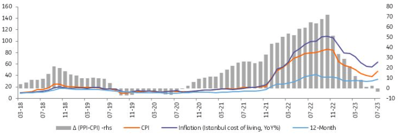 With the July data, cumulative inflation in the first seven months of this year reached 31.1% (vs 58% CBT forecast for the whole year in the latest inflation report). The uptrend will likely continue until the second quarter of next year, given that all major inflation drivers are becoming less supportive with pressures from FX-related effects, administered prices and wages.