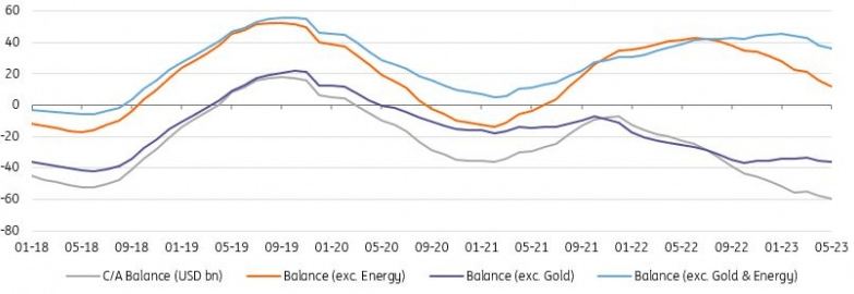 External developments have remained challenging in May with another higher-than-expected current account deficit at US$7.9bn, widening the 12M rolling figure further to US$60bn (translating into c.6.1% of GDP), the highest since late 2013. A quick glance at the May data points to a similar performance in the services balance with respect to the same month of 2022 though a relatively wide deficit in the goods balance driven by higher core trade and gold deficits despite improving energy trade balance.