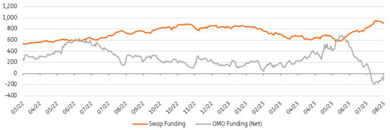 The CBT also signalled “quantitative tightening and selective credit tightening to support the monetary policy stance” in its rate-setting statement. Following that signal, it hiked Required Reserve Ratios for FX-protected deposits to 15% to mop up excess liquidity in the system. With the decision, TRY450bn is expected to be withdrawn from the system, again creating a TRY liquidity deficit.