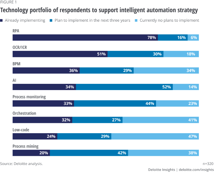 One noteworthy area of investment is software, which is expected to witness double-digit growth in 2023. Organizations are intensifying their utilization of core applications and platforms, directing resources toward tools that support efficiency improvements. Notably, the adoption of RPA and No-Code and Low-Code process automation solutions has seen a notable uptick, with 78% and 24% of businesses respectively having implemented these technologies by 2020. Since then, the adoption of automation tools has been on the rise as labor shortages, the rising cost of labor, and the rise of AI have all pushed automation into the spotlight.