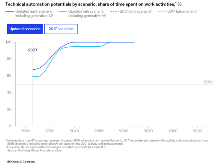 The potential of automation to boost global productivity growth was highlighted by McKinsey well before generative AI made it big. Back in 2017, McKinsey called for annual productivity increases of 0.8% to 1.4% from the use of automation. I believe these expectations need to be revised upward given the technological advancements that have changed the world in the last couple of years. A recent McKinsey report sheds light on the significant impact of Generative AI on automation potential, indicating a remarkable acceleration in the pace of automation. Integrating existing technologies with Generative AI has expanded the percentage of hours that can theoretically be automated from approximately 50% to an impressive 60%–70%. UiPath is at the forefront of this transformative wave, having recently bolstered its AI offerings with Generative AI capabilities.