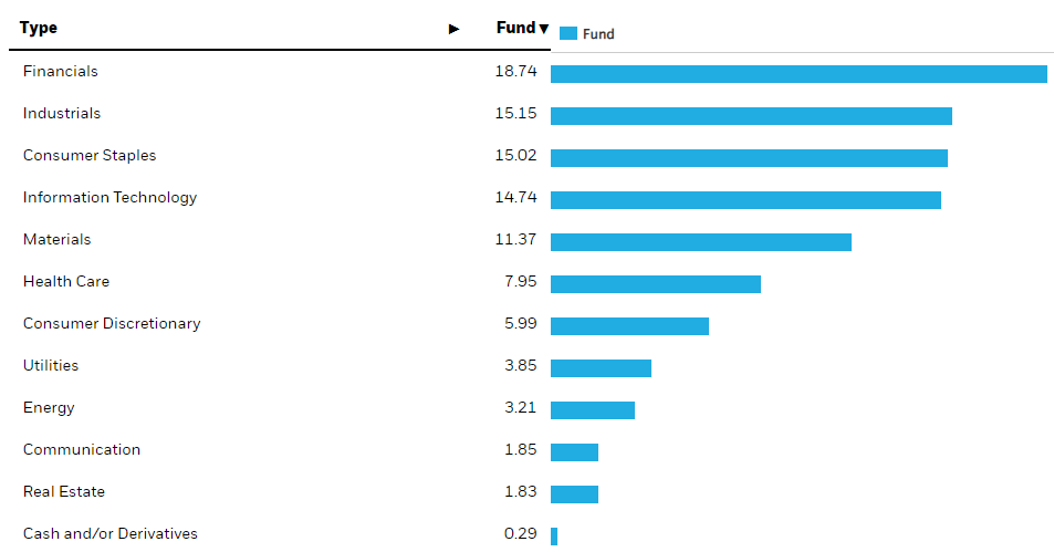 It is a value-weighted ETF dominated by issues on local Chinese exchanges, not ADRs. That means that there aren’t too much of the tech exposures that are typical in Chinese ETFs. It is a lot of industrial exposures that would be traditionally less accessible to foreign investors, as well as some financial exposures. There is also meaningful exposure to consumer staples.