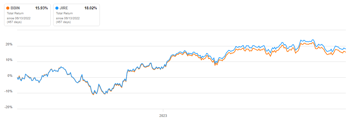 To help understand how BBIN is performing, I will compare it against one of the other ETFs from JPMorgan, the JPMorgan International Research Enhanced Equity ETF (JIRE). JIRE benchmarks against the MSCI EAFE index but isn’t bound by it in its security selection process. The ETF has $5.3b in AUM, with fees of 24bps. The TTM yield is 2.35%.