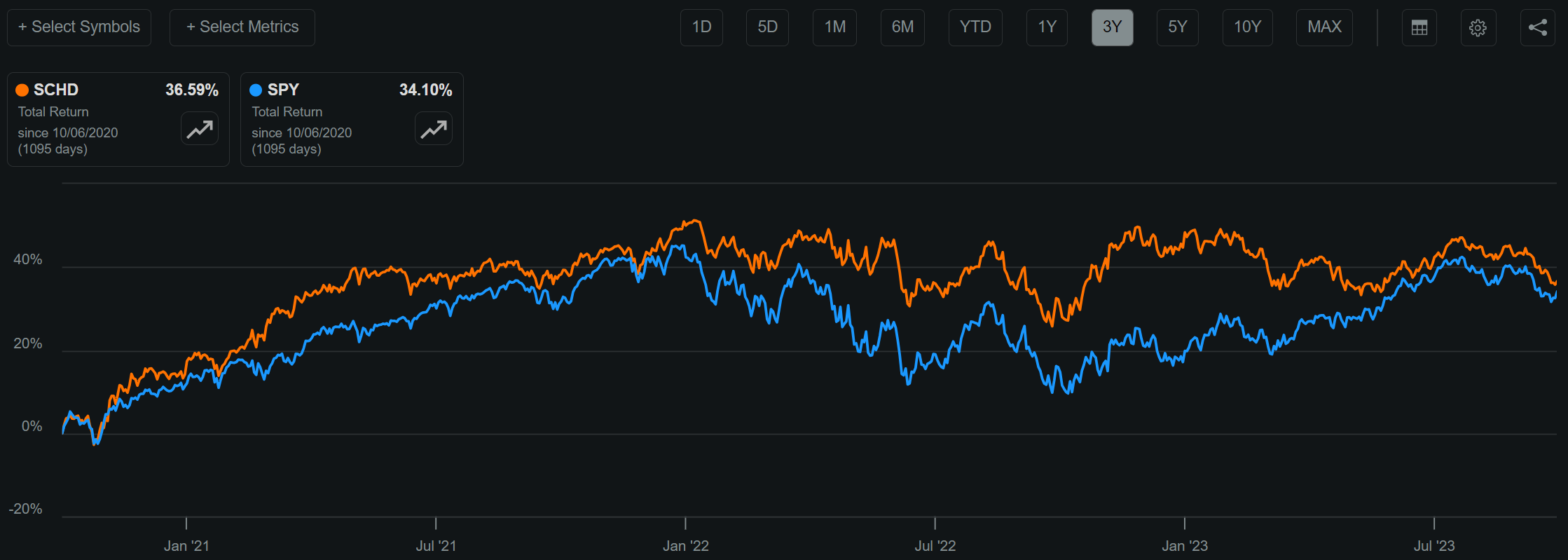 As most savvy investors know, a decent dividend yield (SCHD’s current yield is 3.8%) combined with an above-average growth rate and low underlying valuations is a recipe for outperformance over the long run. As shown below, SCHD has outperformed the SPY over the past 3 years from a total return standpoint, with a 36.6% return compared to the 34.1% of SPY.