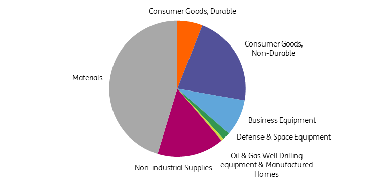 US manufacturing is a highly diversified sector that contributed $2.9tr to GDP in 2023, equivalent to just over 10% of all economic output. It also employed 13 million people, accounting for 8.3% of all US jobs. The sector can be split into two broad groupings. Firstly, there are final products & non-industrial supplies, which represent 54% of manufacturing output and includes the likes of cars, furniture and computers. The other 46% are classified as “materials”, which includes the production of items such as textiles, paper, steel and manufactured parts that go into the former category of final products.