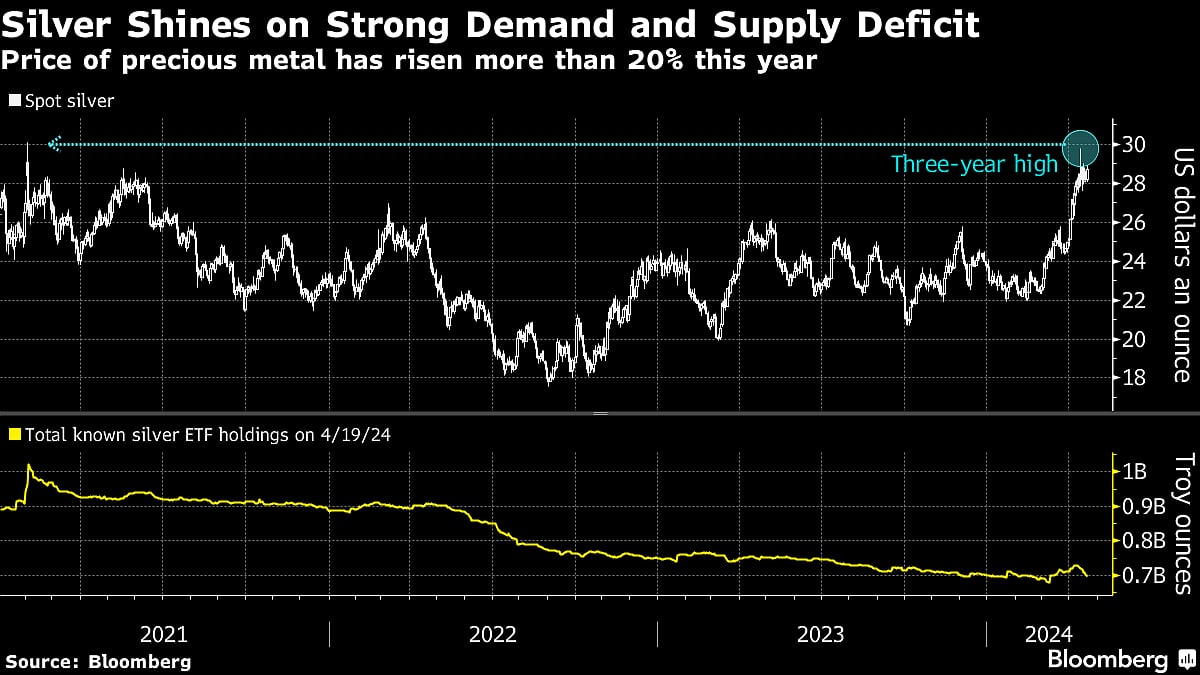 Silver has had a strong start this year, rising more than 20% as the white metal follows gold’s rally. Silver’s price has approached levels not seen since retail traders squeezed the market in early 2021 and is within striking distance of $30 an ounce. Record industrial usage, especially from green economy applications such as solar panels, and an ongoing supply deficit should underpin prices going forward, according to the Silver Institute. That may prompt investors to meaningfully return to silver-backed exchange-traded funds, helping push prices even higher.
