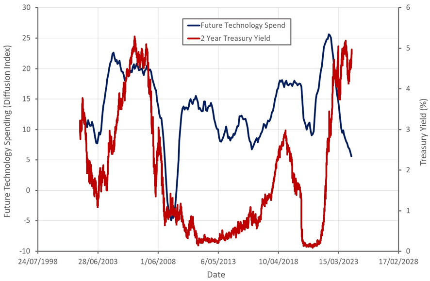 Figure 4: Future Technology Spending Plans and US 2-Year Treasury Yield (source: Created by author using data from The Federal Reserve)
