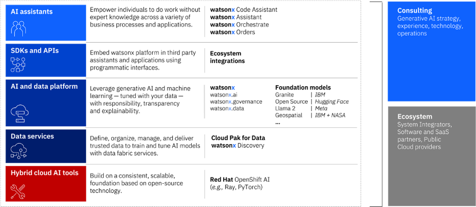 One of the company’s recent initiatives for its AI strategy was the launch of watsonx AI platform for Enterprises in 2023 to offer trained foundation models and open-source models for customers with access to the “toolset, technology, infrastructure, and consulting expertise to build their own – or fine-tune and adapt available AI models – on their own data and deploy them at scale in a more trustworthy and open environment to drive business success.”
