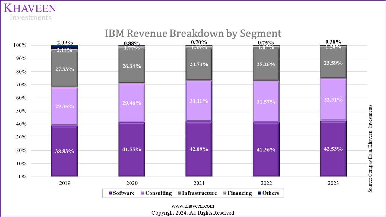 As seen in the chart above, IBM’s software and consulting segment share of revenue has been increasing since 2019. However, the Software segment’s share of revenue improved by 3.51% over the last 5 years, which is the highest growth among all segments, whereas Infrastructure and Financing segments had their share of revenues decline over the same period.