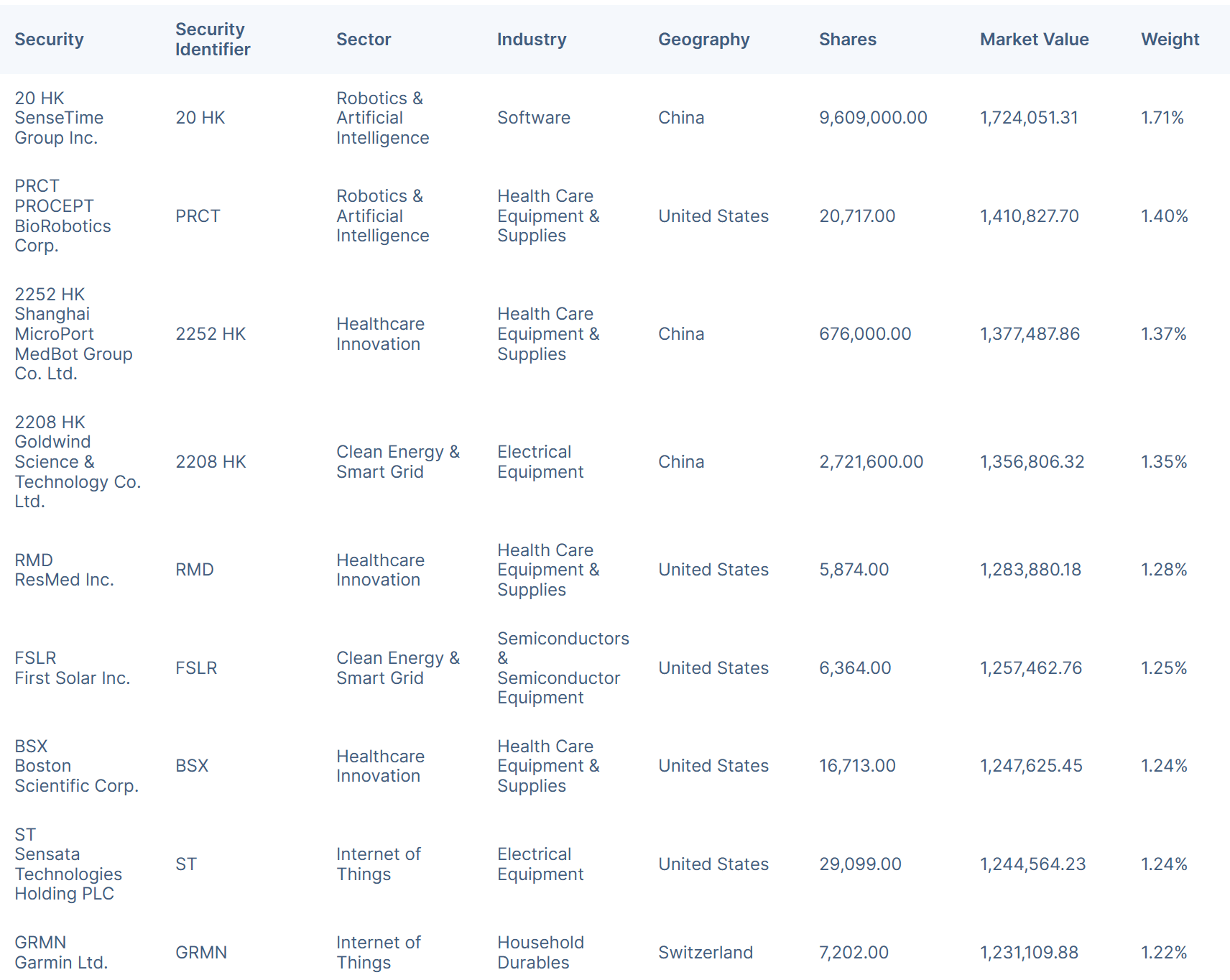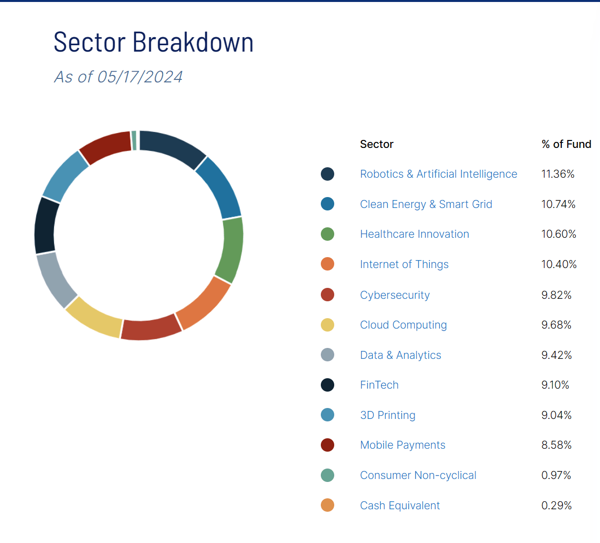 Robotics and AI take the largest allocation at 11.36% with Clean Energy & Smart Grid (which are needed longer term for AI) coming in as the second largest overall allocation. If I were a big believer in investing in disruptive technologies, the categorizations here would only further my conviction that this is a fund to play that.