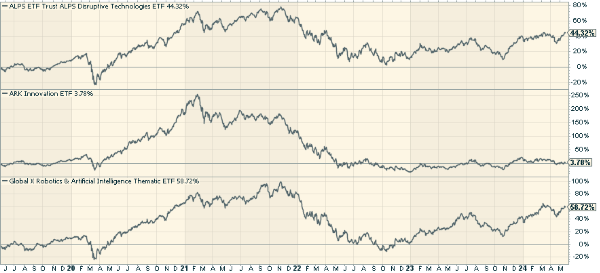 However, there are also inherent risks associated with investing in disruptive technologies. The rapid pace of innovation can lead to significant volatility, as companies may face challenges in scaling their technologies or navigating regulatory hurdles. Moreover, the competitive landscape is constantly fluid and changes with new entrants and technological advancements posing threats to established players. And let’s face it – many of these companies are still having a hard time recovering from their 2021 respective peaks.
